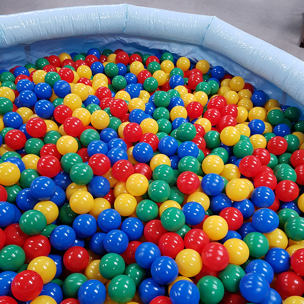 Das runde, großzügige Bällebad mit stabiler aufblasbarer Umrandung bietet viel Platz zum Spielen und sorgt gleichzeitig für Sicherheit beim Toben. Die vielen leuchtend bunten Plastikbälle in Rot, Blau, Gelb und Grünschaffen sofort eine fröhliche Atmosphäre und laden Kinder dazu ein, direkt hineinzuspringen.