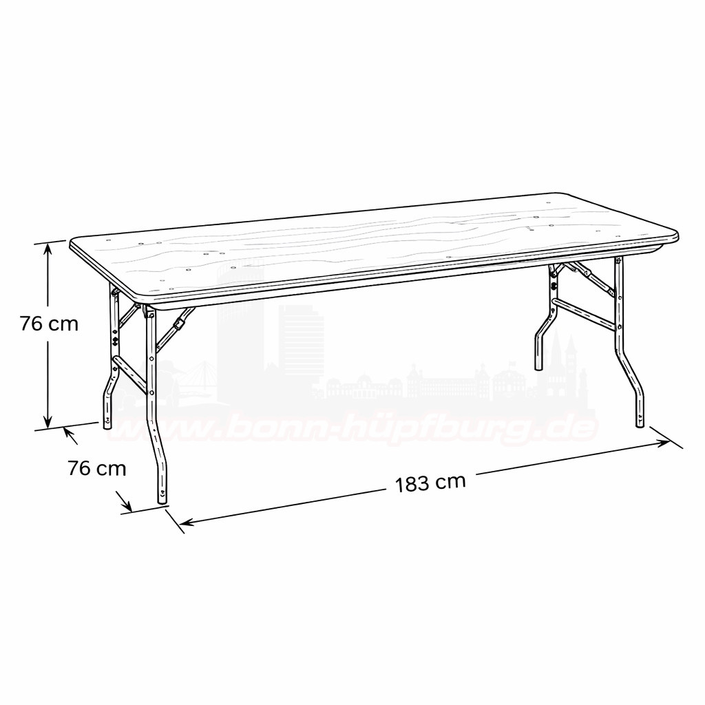 Stabiler Banketttisch in hochwertiger Qualität (183 x 76 cm) zur Miete in Bonn. Ideal für Kindergeburtstage, Familienfeiern, Buffets und Events. Mit robuster Holzplatte, abgerundeten Ecken und stabilem Metall-Klappgestell. Einfach online anfragen und an unserer Ausgabestelle abholen. Wochenendpauschale (Freitag–Montag) verfügbar.