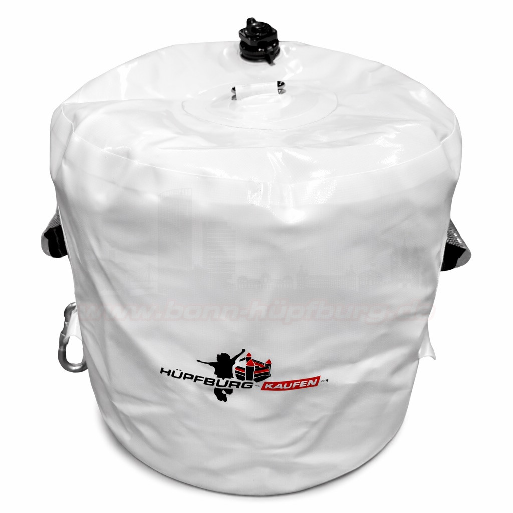 Auf dem Produktbild sehen Sie einen robusten weißen Wassersack aus strapazierfähigem Material, der speziell für den Einsatz an Eventzelten entwickelt wurde. Der Sack besitzt: