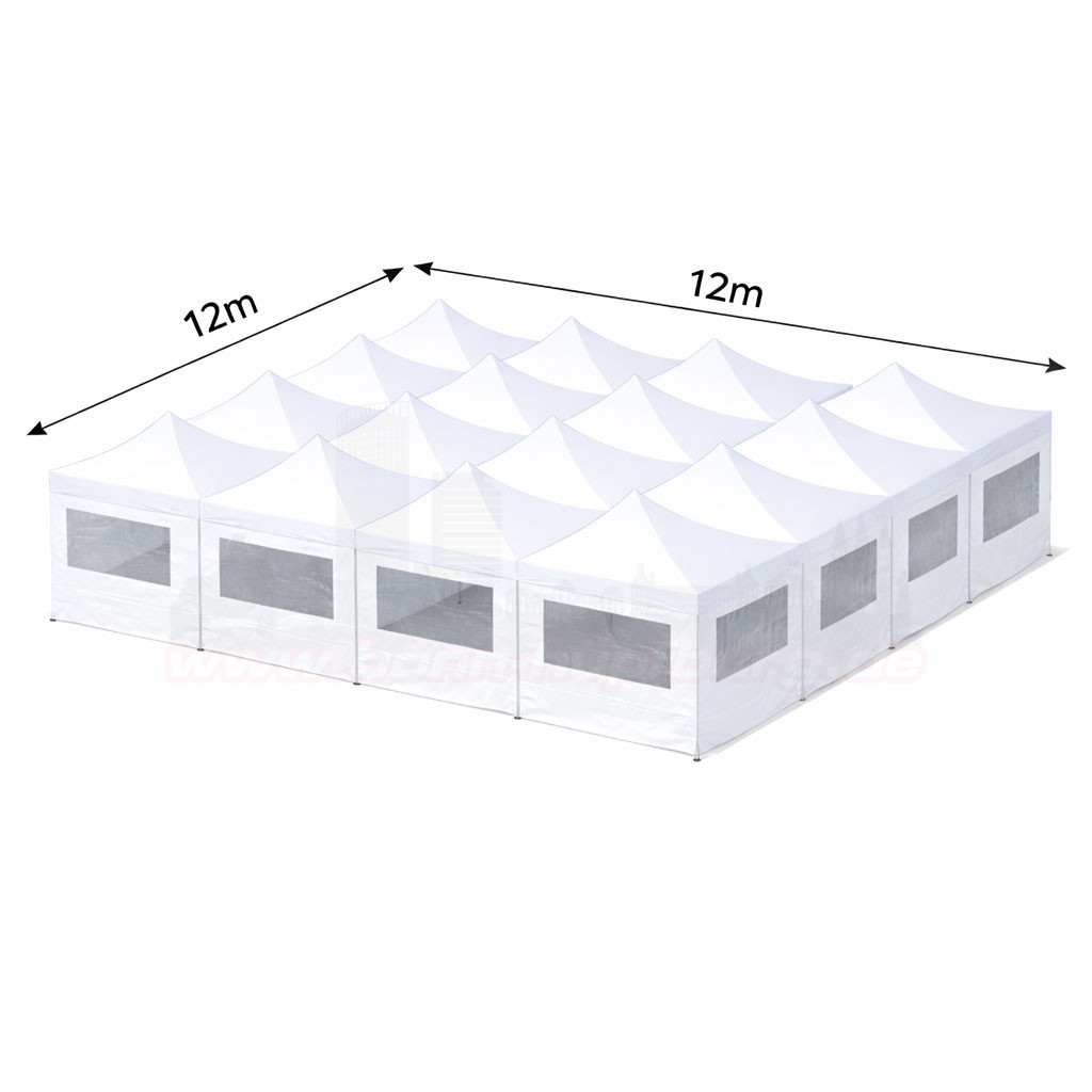 Große Faltzelt Kombination 12m x 12m in Weiß mit Seitenteilen und Fenstern – ideal für Kindergeburtstage, Familienfeste und Events in Bonn. Die elegante Pagoden-Dachstruktur sorgt für eine hochwertige Optik und viel Platz für Gäste. Wochenendpauschale (Freitag bis Montag) möglich. Abholung an unserer Ausgabestelle in Bonn.