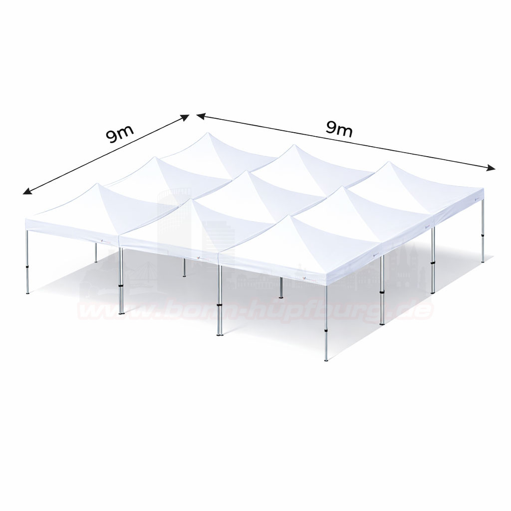 Auf dem Bild ist eine große Kombination mehrerer weißer Faltpavillons zu sehen, die zu einer Gesamtfläche von 9 m × 9 m zusammengestellt sind.