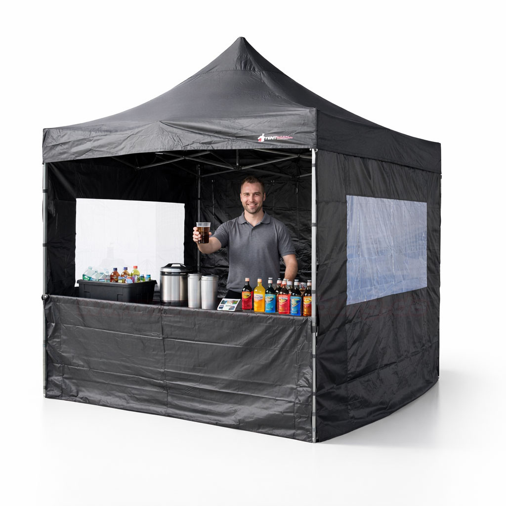Diese Kombination macht das Zelt zu einem perfekten mobilen Verkaufsstand für Veranstaltungen.