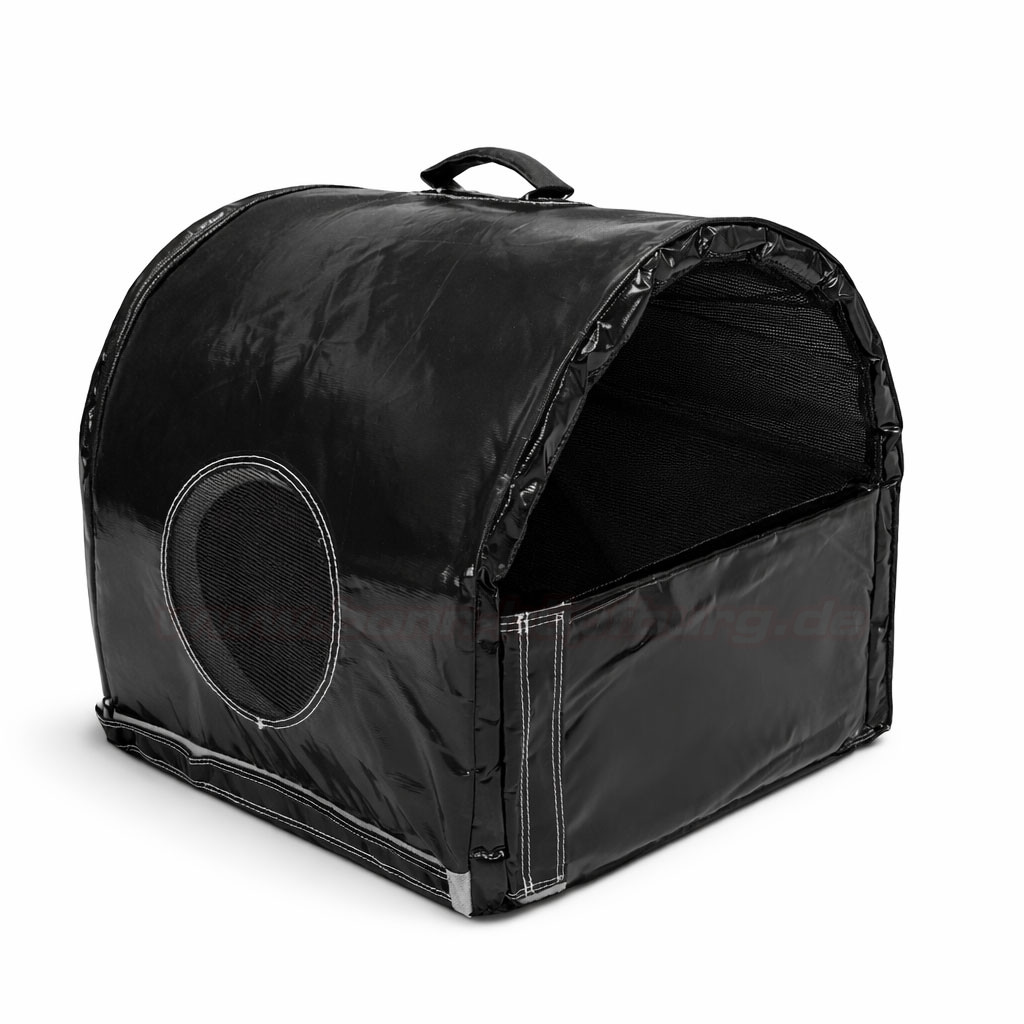 Auf den Produktbildern ist eine maßgeschneiderte, halbrund geformte Schallschutzhaube in Schwarz zu sehen.