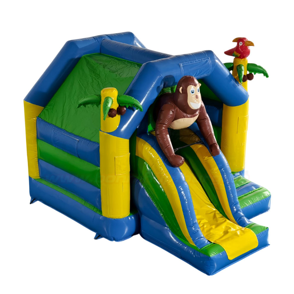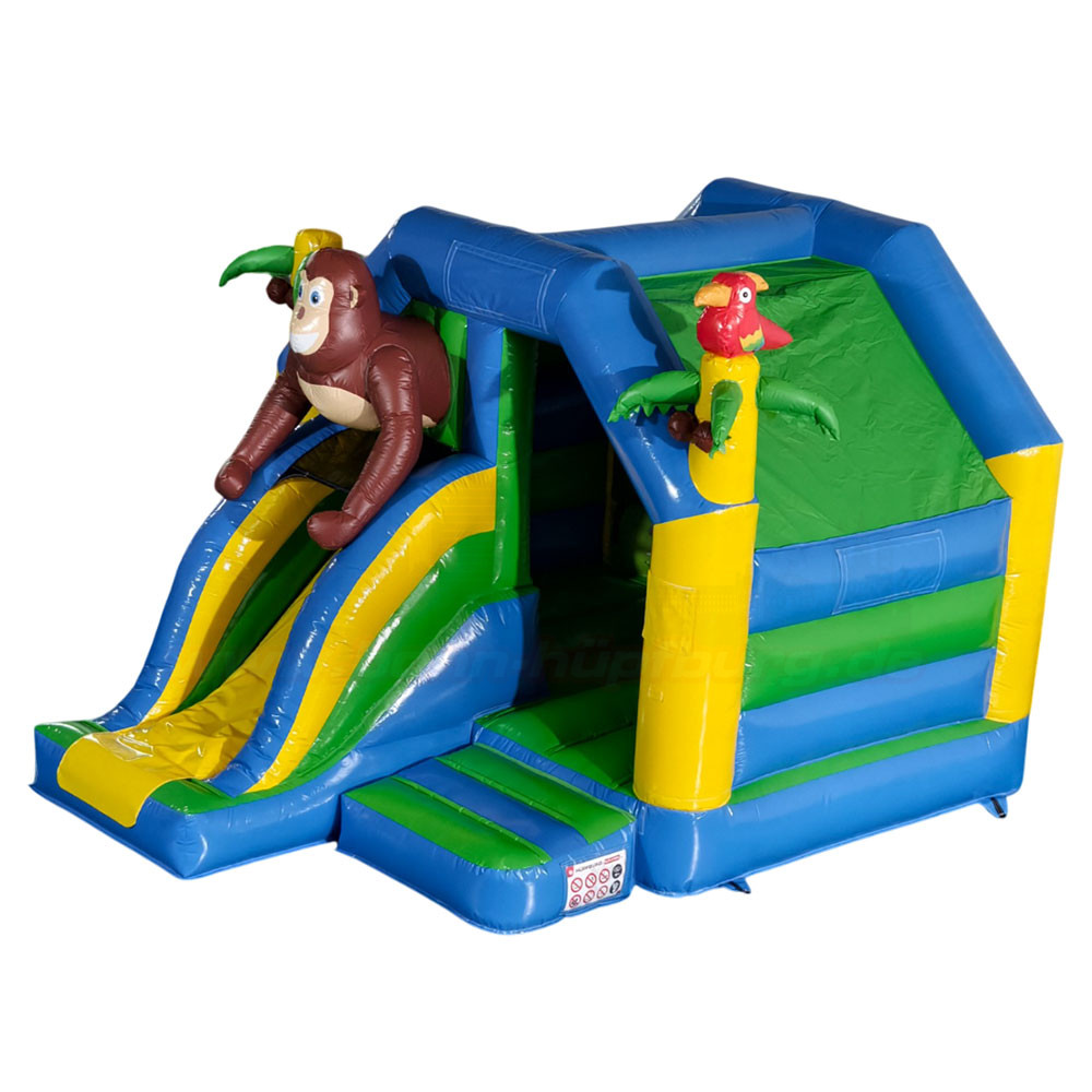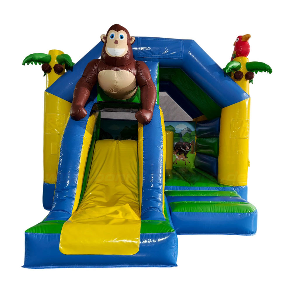 Die Hüpfburg Slide Combo Dschungel mit Rutsche kombiniert Hüpfspaß und Rutschvergnügen in einem farbenfrohen Dschungel-Design mit Affe, Palmen und Papagei. Perfekt für Kindergeburtstage und Events in Bonn – einfach online anfragen und selbst abholen. Wochenendpauschale verfügbar!