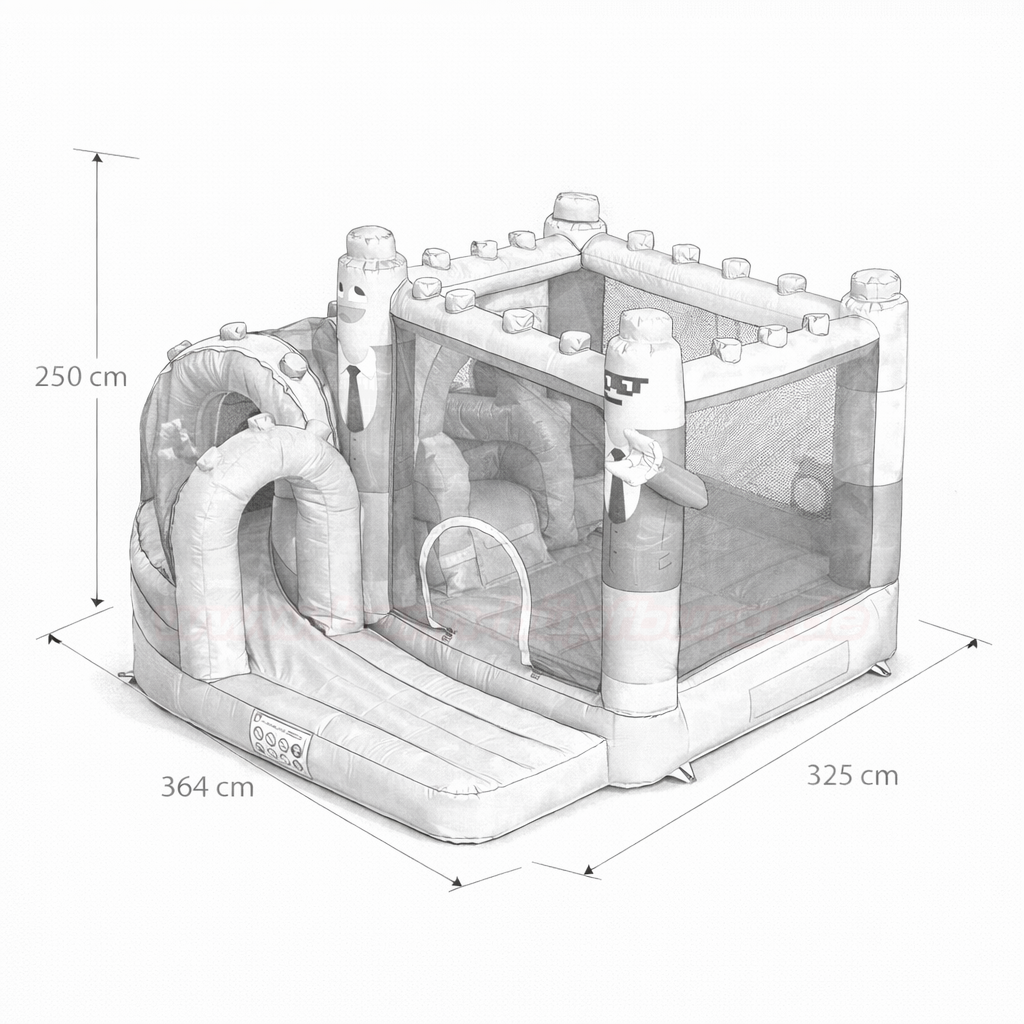 Schon auf den ersten Blick fällt das liebevoll gestaltete Design auf: Zwei große Figuren im typischen Baustein-Look begrüßen die Kinder am Eingang, während kräftige Farben wie Rot, Gelb, Blau, Orange und Lila für eine fröhliche, einladende Atmosphäre sorgen. Die Kombination aus Hüpfbereich und integrierter Spielfunktion macht diese Hüpfburg zu einem vielseitigen Erlebnis.