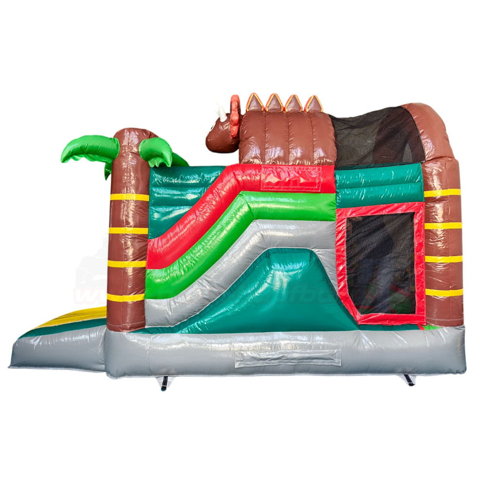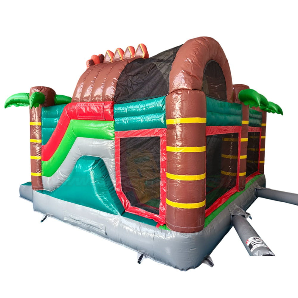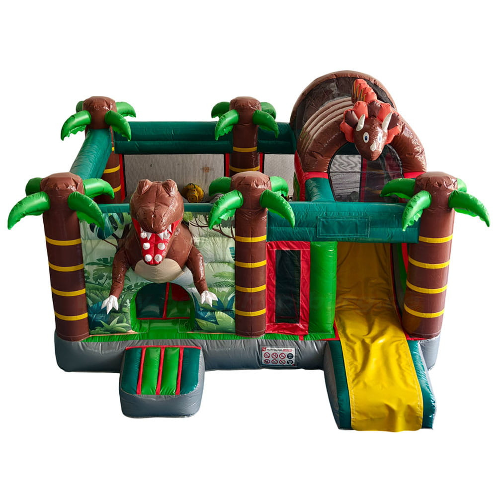 Bereits auf den ersten Blick überzeugt diese Hüpfburg mit ihrem aufwendig gestalteten Dinosaurier-Thema: Große, braune Dinofiguren mit freundlichem Gesichtsausdruck, kräftige grüne Palmen und ein echter Hingucker – die integrierte Rutsche mit gelber Gleitfläche, die von einem weiteren Dino bewacht wird. Der Eingang wird von einem beeindruckenden Dino mit offenem Maul gestaltet – ein echtes Abenteuer-Portal für die Kids!