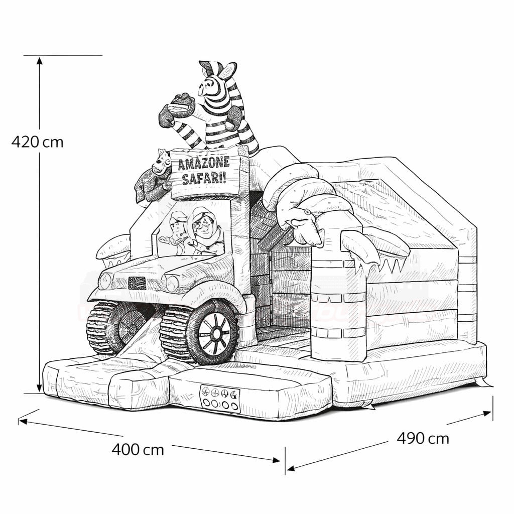 Die Hüpfburg Slide Combo Amazonas Safari ist eine bunte Hüpfburg mit integrierter Rutsche im Safari-Design mit Zebra und Jeep-Optik. Perfekt für Kindergeburtstage und Events in Bonn – jetzt einfach online anfragen und selbst abholen!