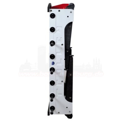 Der Kicker Trolley überzeugt durch sein modernes, sportliches Design: Der Tisch ist überwiegend weiß gestaltet, kombiniert mit roten Seitenelementen und schwarzen Standfüßen. Auf dem Spielfeld stehen sich rote und blaue Spielfiguren gegenüber – perfekt für spannende Matches zwischen Freunden, Familie oder Kollegen.