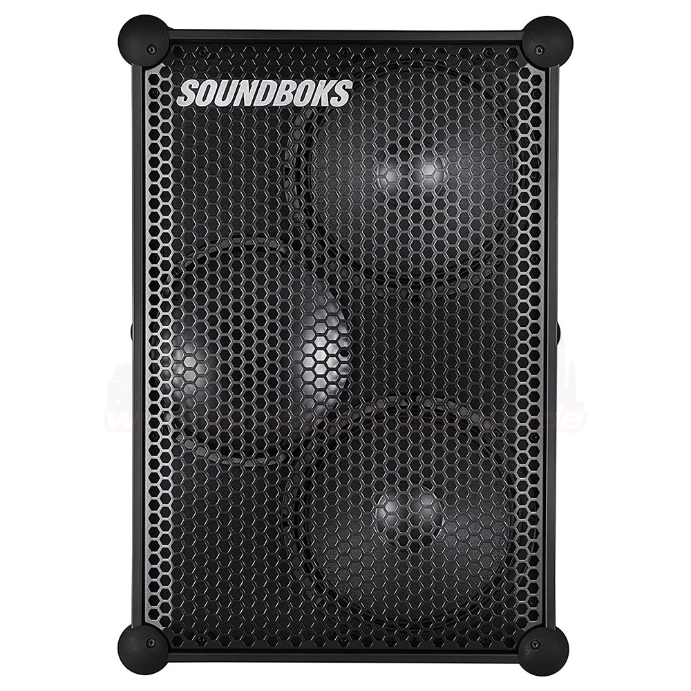 Die schwarze, stabile Box mit Metallgitter-Front schützt die verbauten Lautsprecher zuverlässig. Hinter dem markanten hexagonalen Schutzgitter mit Soundboks-Logo sitzen mehrere Lautsprecher-Chassis, die für kraftvollen Sound sorgen.