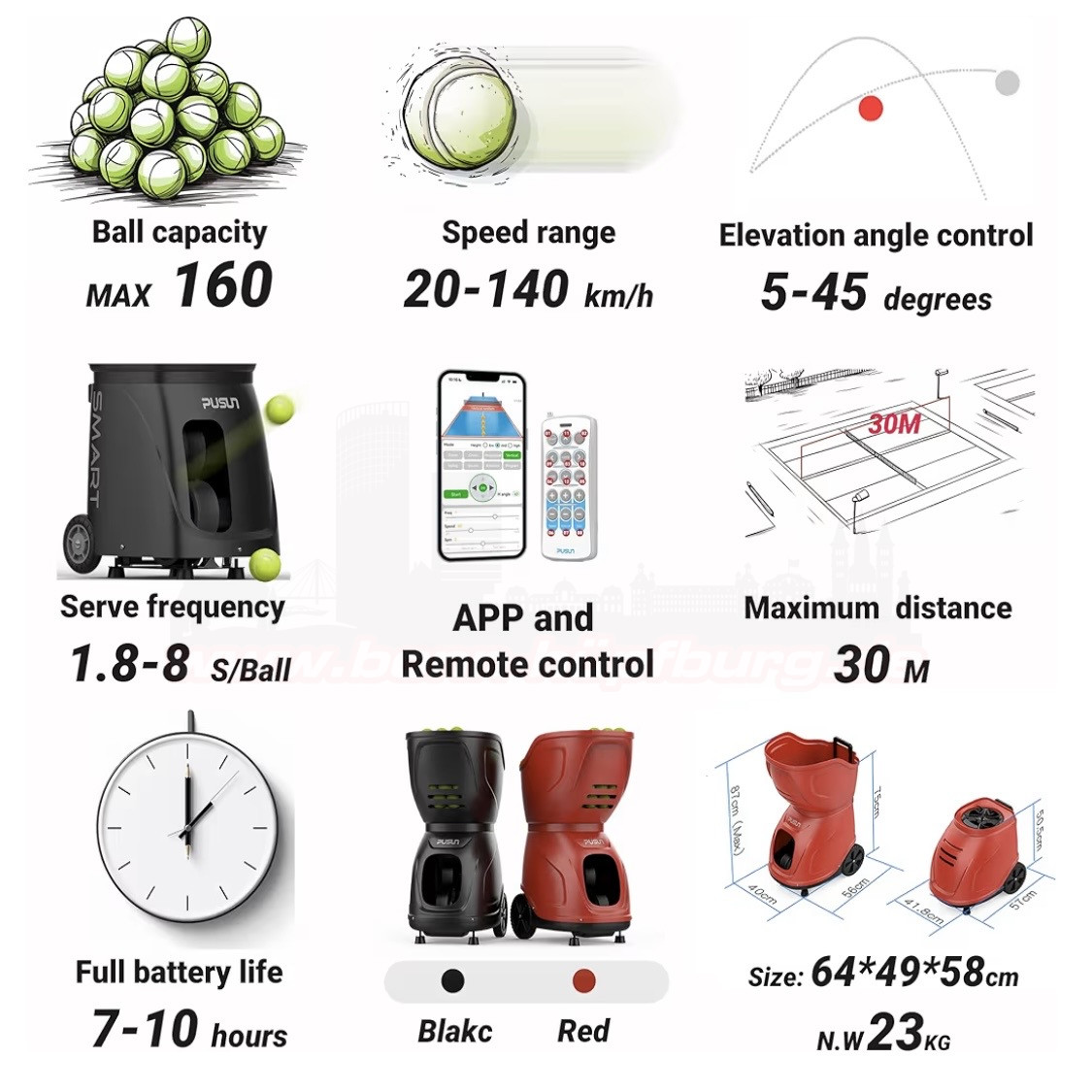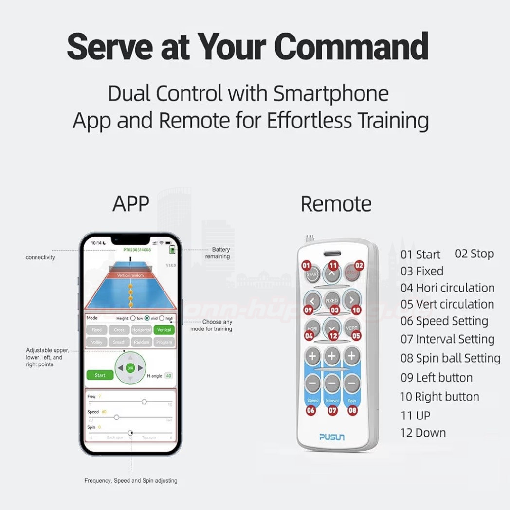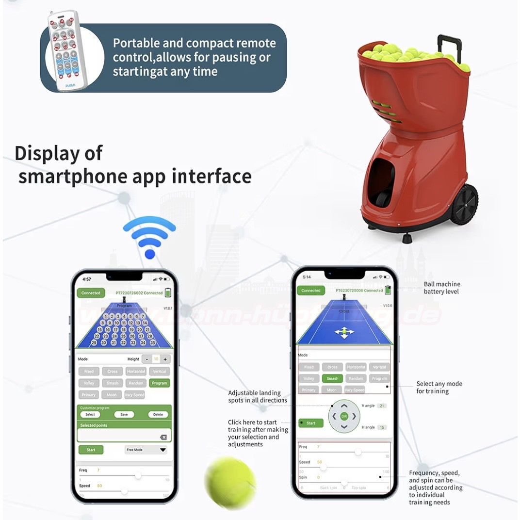 Mit der Pusun Tennis Ballmaschine erlebst du abwechslungsreiche Ballwechsel und individuelle Trainingsmöglichkeiten – ganz ohne Trainingspartner. Dank 35 Landepunkten und verschiedenen Spielmodi werden Vorhand, Rückhand, Volley, Lob und Smash realitätsnah simuliert.