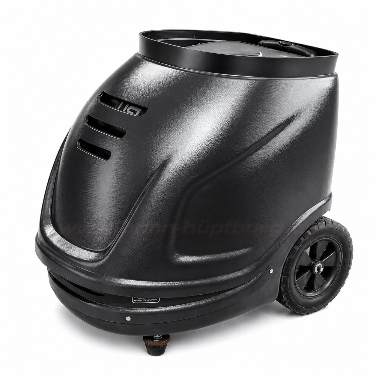 Schon beim ersten Blick fällt das robuste, schwarze Gehäuse mit moderner Formgebung auf. Die Maschine steht stabil auf einem kompakten Unterbau mit zwei großen Rädern, sodass sie sich leicht bewegen lässt.