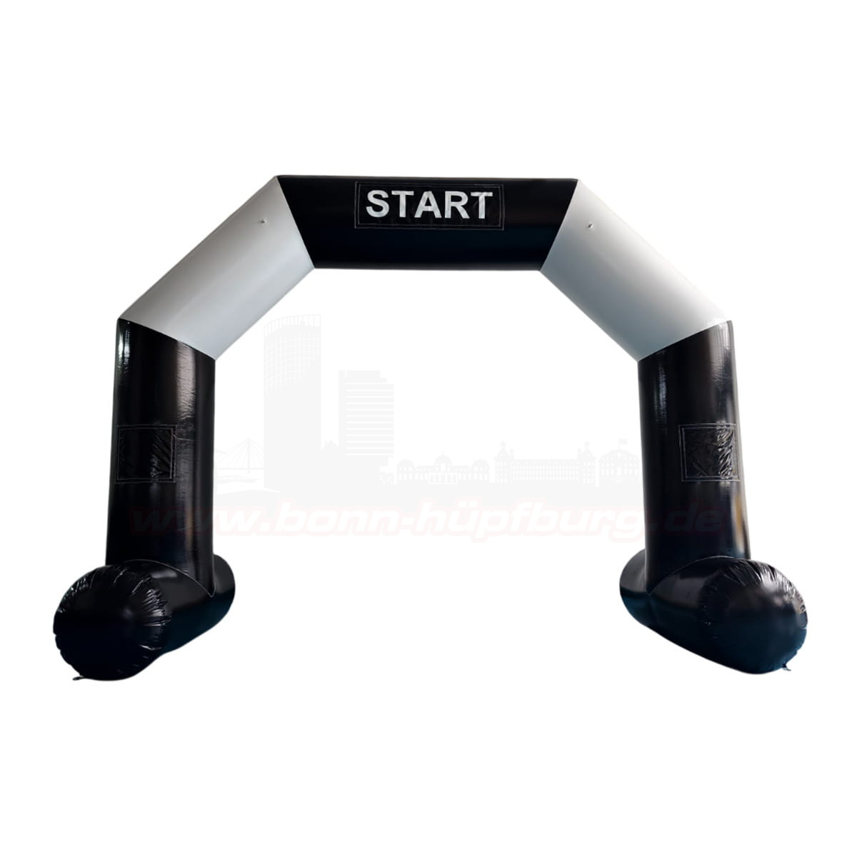 Schon auf den ersten Blick überzeugt der Torbogen durch sein modernes Design: kräftige Schwarz-Weiß-Farbkombination, stabile aufblasbare Säulen und ein deutlich sichtbarer „START“-Schriftzug auf der oberen Querstrebe. Die breite, gebogene Form sorgt dafür, dass der Torbogen gut sichtbar ist und sich ideal als Startpunkt für Rennen, Spiele oder Eventbereiche eignet.